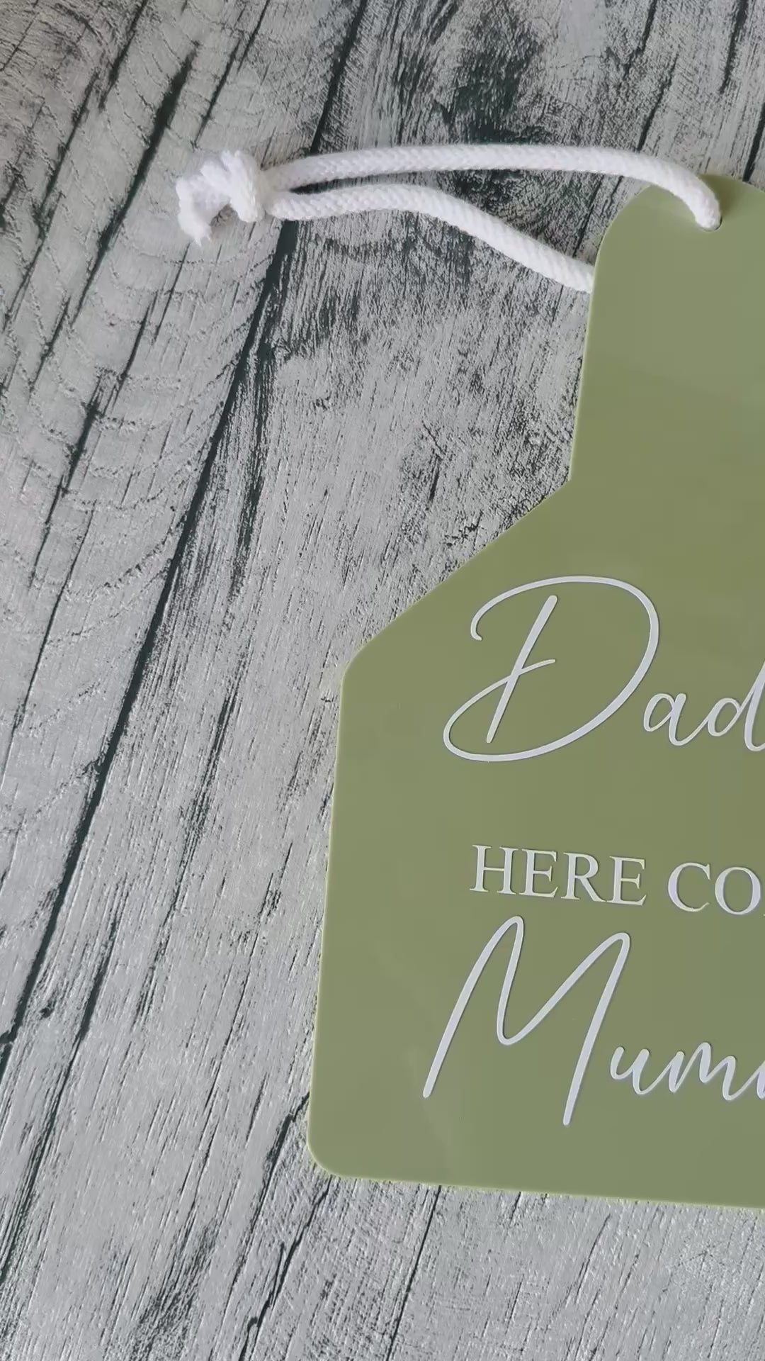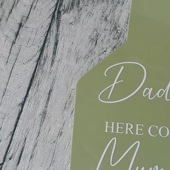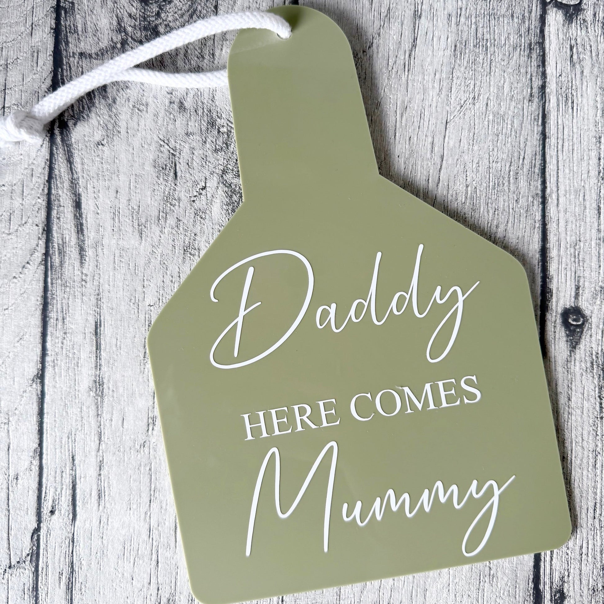 Make your wedding ceremony truly special with our 'Daddy here comes Mummy" sign. Small and lightweight for young children to walk down the aisle to announce the entrance of the Bride. Made from high quality materials this sign is built to last not just for the wedding ceremony but will last a life as a keepsake to remember your special day.