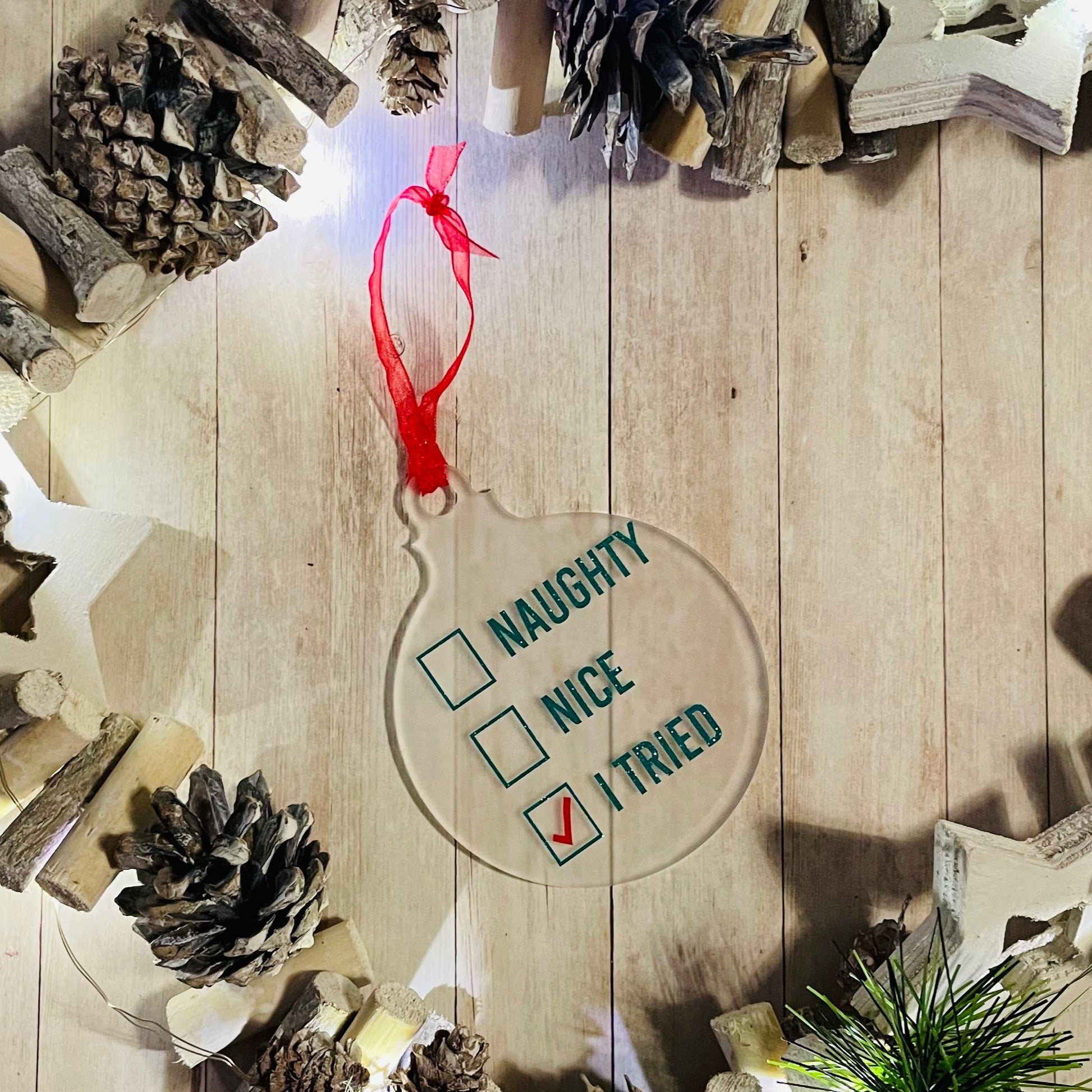 Add a playful touch to your holiday décor with this cheeky "Naughty, Nice, I Tried" Christmas bauble! Perfect for those who embrace the festive spirit with a wink and a smile. Featuring a festive design with bold, fun lettering, this bauble proudly acknowledges that sometimes, being good is a work in progress. Hang it on your tree as a conversation starter or gift it to a loved one who appreciates a bit of holiday humor. Made from Frosted acrylic and green glitter vinyl, it shines brightly among your ornaments and spreads a lighthearted vibe all season long.