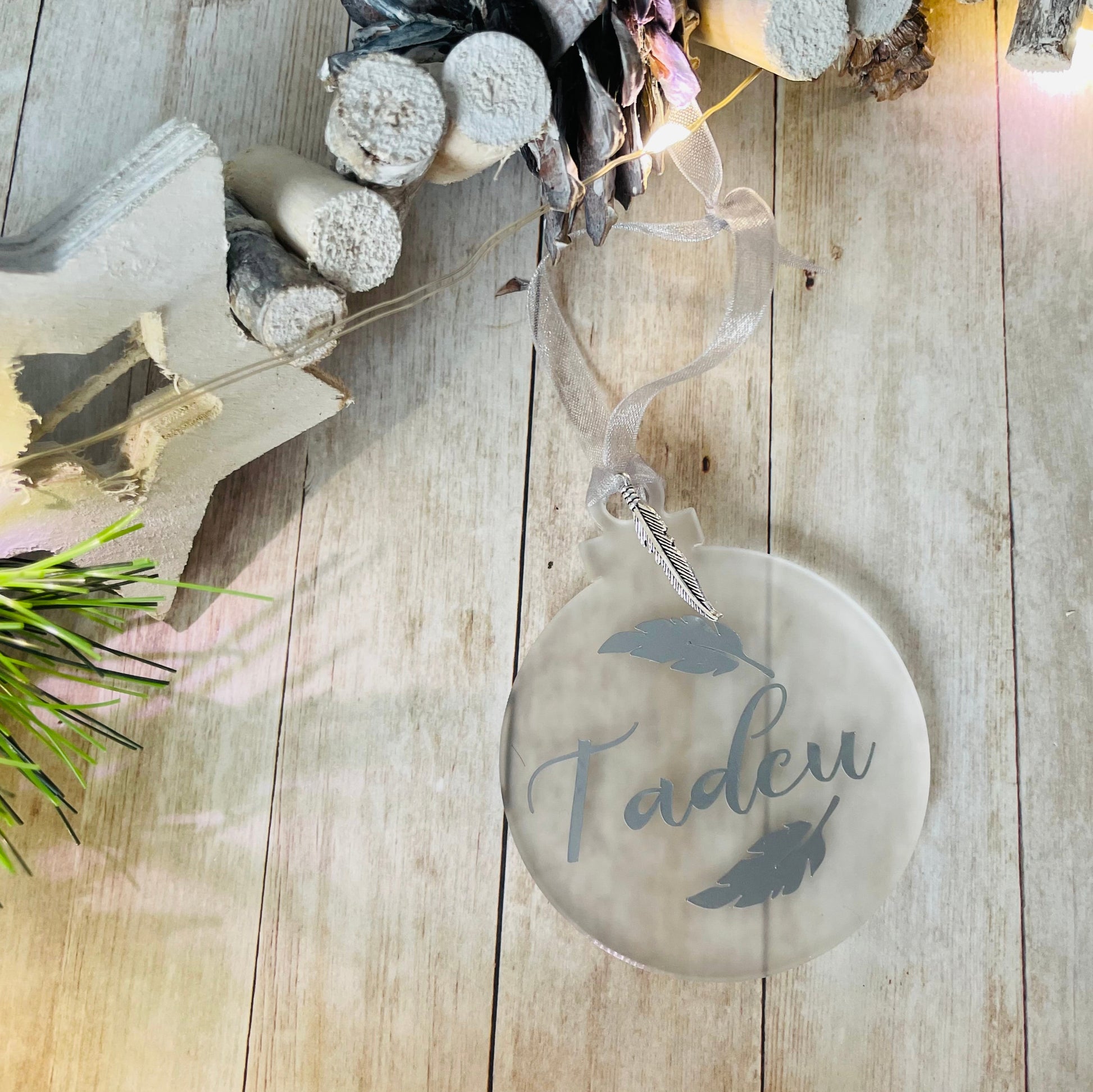 This Mum bauble is made with matt silver vinyl with a silver feather charm